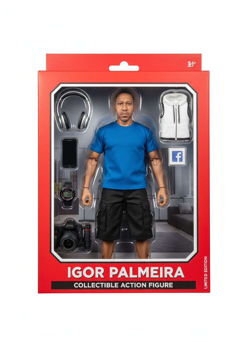 “A hyperrealistic studio photograph of a collectible action figure named ‘IGOR PALMEIRA’ displayed in a premium, bright red and white toy box packaging, with the figure standing in the center. The figure is wearing a t-shirt (image n°2) and baggy black cargo shorts. The box features custom molded plastic compartments for a set of accessories: a pair of silver over-ear headphones, a black smartphone, a black digital watch, a black DSLR camera with an extended handle/grip, a spare white battery, a hoodie white and black vest, and a small white box with the Facebook logo. Bright studio lighting, clean background, high detail, flat lay perspective.”