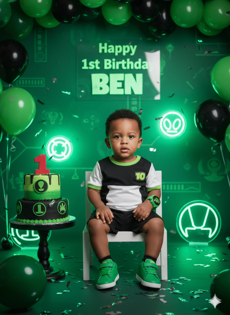 A Ben 10 cake sits on one side, decorated with Omnitrix symbols, green icing, and a bold “1” topper.