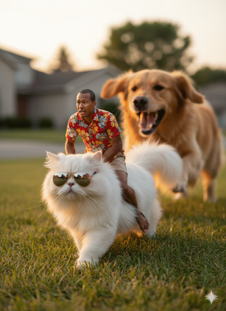 Ação/Conflito: A dupla está envolvida em uma perseguição em alta velocidade por um gramado suburbano bem iluminado. A poucos centímetros atrás, um enorme Golden Retriever babando — ou um Labrador atrapalhado — salta com a boca escancarada, em um latido brincalhão, mas assustador. A cena é capturada de um ângulo baixo, fazendo as lâminas de grama parecerem obstáculos gigantes, como uma selva em miniatura.