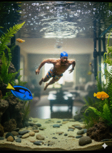 Cinematography: A wide-angle shot taken through the water’s surface or pressed against the glass, making the water droplets and small air bubbles appear enormous. Use shallow depth of field to focus intensely on the swimmer, while the distant living room background is softly blurred.
