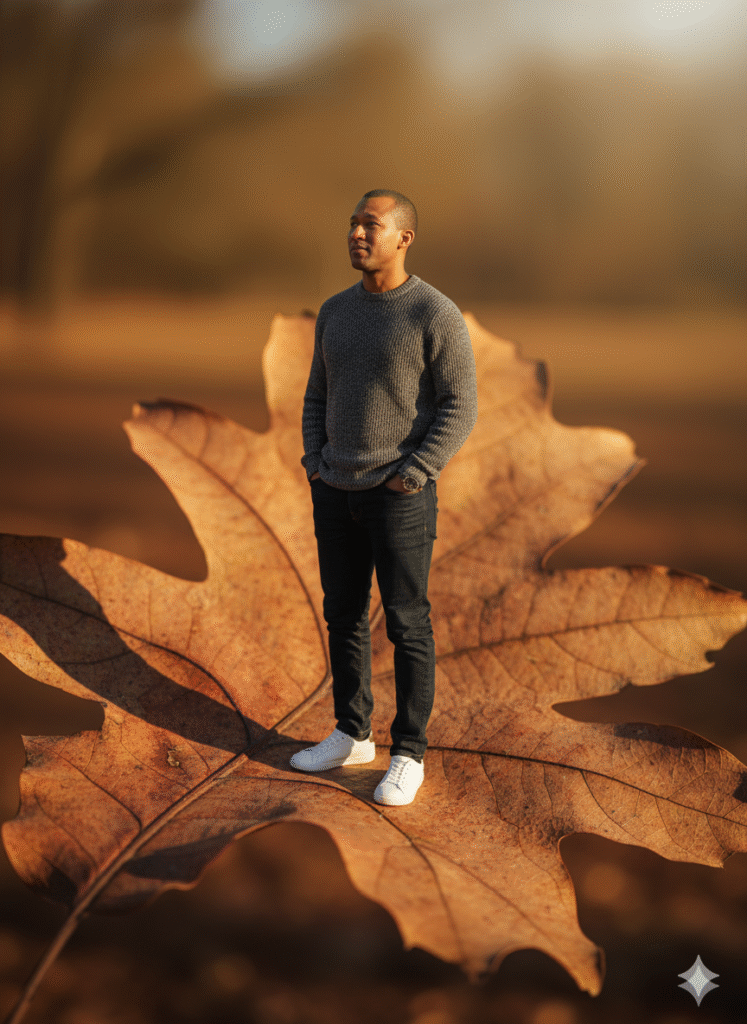 *Subject and Attire:* The man, scaled to approximately one inch tall, possesses a photorealistic human face (reference image highly recommended for integration). He wears contemporary *casual fashion attire*: a fitted charcoal knit sweater, dark tailored denim, and pristine white minimalist sneakers. His pose is one of confident contemplation, his head slightly tilted as he gazes into the vast, blurry background.