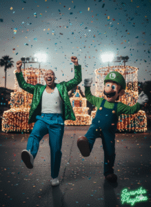Create a hyper-realistic image of the uploaded person wearing a fun coordinated green sequin jacket, white tank, blue high-waisted pants, with face 100% preserved and identical. They joyfully dance with a photorealistic Luigi as colorful confetti rains around them during an amusement park parade. Floats with sparkling fairy lights glow behind them. Bright celebration lighting with cinematic contrast. Professional DSLR, 24mm wide portrait, f/2.8, 8K, dynamic motion energy. “HORA DA DIVERSAO” in glowing neon green bottom right.