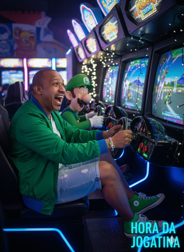 Create a hyper-realistic image of the uploaded person styled in a green bomber jacket with blue accents, white fitted tee, denim shorts, wearing green high-top sneakers and silver Luigi-themed charm bracelet, with face 100% preserved and identical. They excitedly race photorealistic Luigi on an arcade kart-racing game, both laughing mid-action. Vibrant arcade lights and sparkly fairy strands glow behind them. Dramatic multicolor lighting, reflections on polished arcade screens. Professional DSLR, 35mm environmental portrait, f/2.8, 8K clarity. “HORA DA JOGATINA” in bold neon blue script bottom right.
