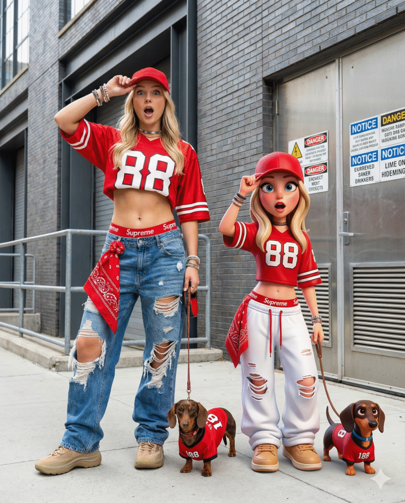 To the right of the woman (same face as the uploaded image), beside her is a stylized 3D cartoon version of the same character (same face as the uploaded image). The cartoon figure mirrors her outfit exactly—red cap, long cropped red jersey, baggy white ripped Pants with red strings Supreme In her right hand, she holds a leash attached to a small dachshund dog standing at her feet. The dog wears a matching red sports jersey with the number “88” perfectly coordinated with her outfit.