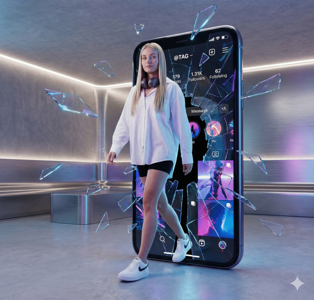 Uma jovem elegante pisa confiante através de um ecrã gigante de smartphone como se estivesse a sair de um mundo digital. Pedaços de vidro partido flutuam dinamicamente ao redor dela, captando reflexos de néon. Ela usa uma camisa branca grande, shorts pretos, tênis Nike brancos e auscultadores ao redor do pescoço. Seu cabelo é longo e liso, e ela tem uma expressão calma e segura de si. Atrás dela, o telefone exibe uma vibrante interface de perfil nas redes sociais. A cena é futurista, com iluminação neon suave e um fundo moderno mínimo. Ultra-realista, detalhe @TAG, reflexos nítidos, movimento dinâmico, superfícies brilhantes, visual cinematográfico 3D.