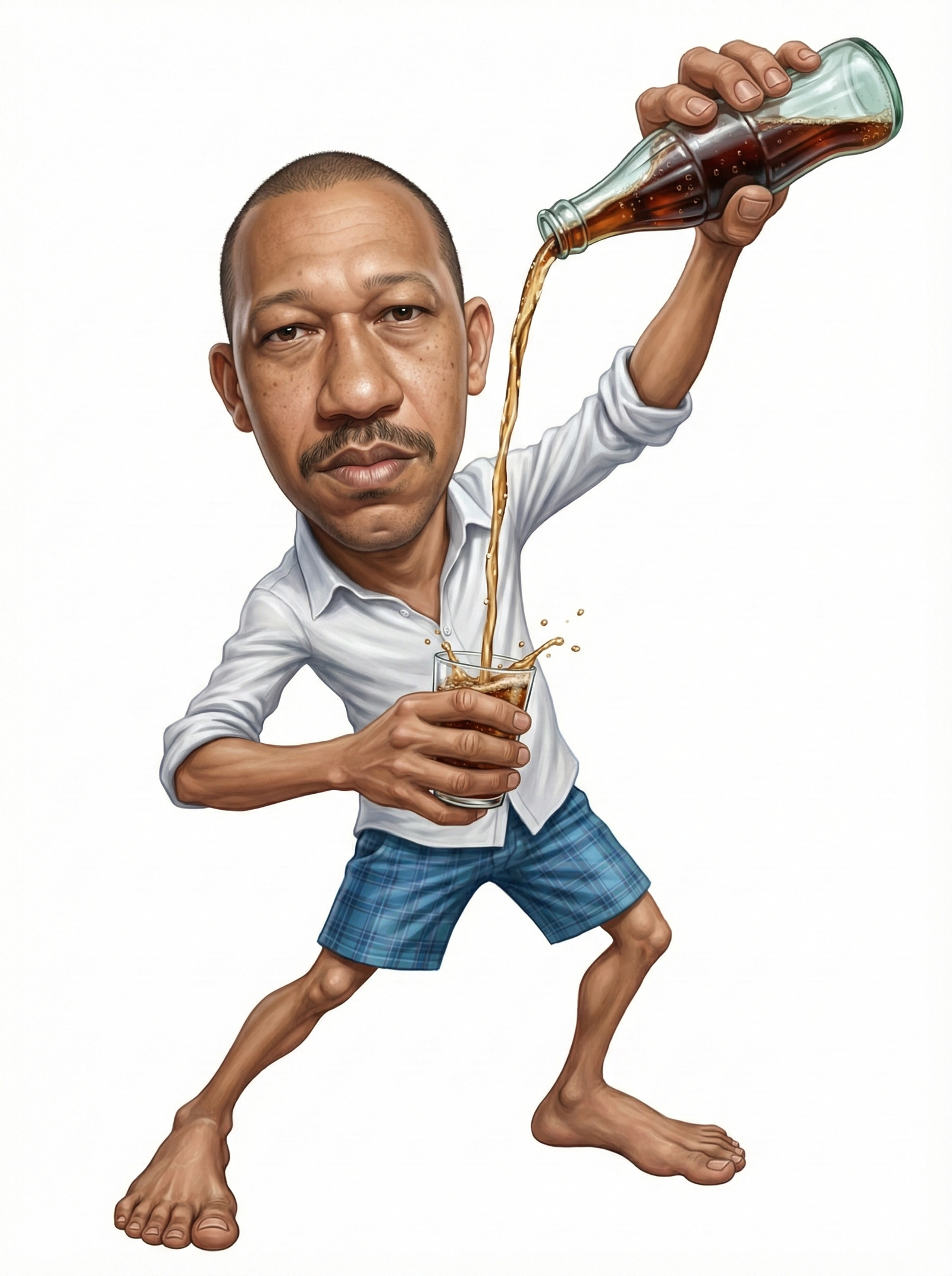 Crie uma ilustração em estilo caricatura hiper-realista, com acabamento profissional e alto nível de detalhe. O personagem é um homem adulto, corpo magro e alongado, proporções exageradas típicas de caricatura, pés grandes e mãos expressivas. Ele está descalço, usando camisa branca de mangas dobradas e short azul com estampa xadrez.