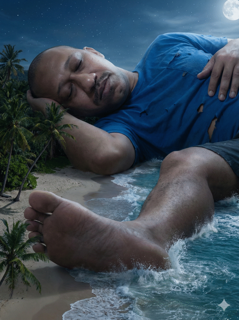 Retrato vertical 3:4, cena de fantasia cinematográfica ultra-realista vista de uma perspectiva imersiva em miniatura de baixo ângulo. Um jovem bonito está dormindo de lado à beira de uma praia tropical, inconsciente, mas respirando suavemente, todo o seu corpo colossal totalmente visível dentro da moldura, estendendo-se da cabeça aos pés ao longo da costa como um gigante mítico encalhado. Use a foto de referência fornecida como a única fonte facial e de identidade.