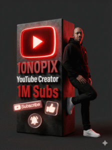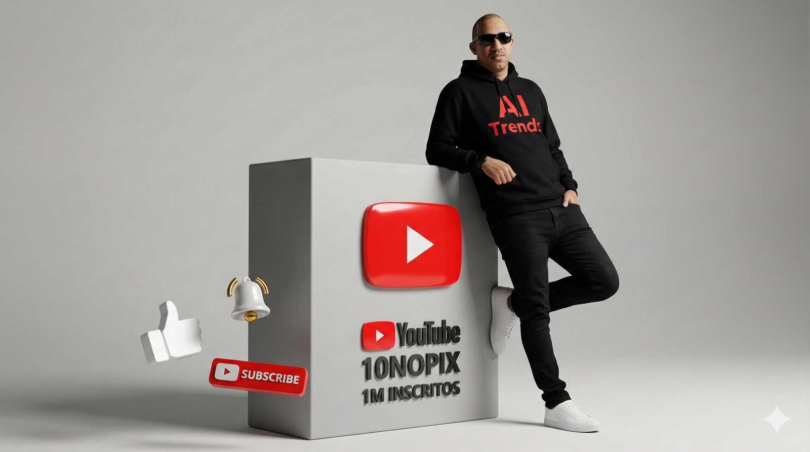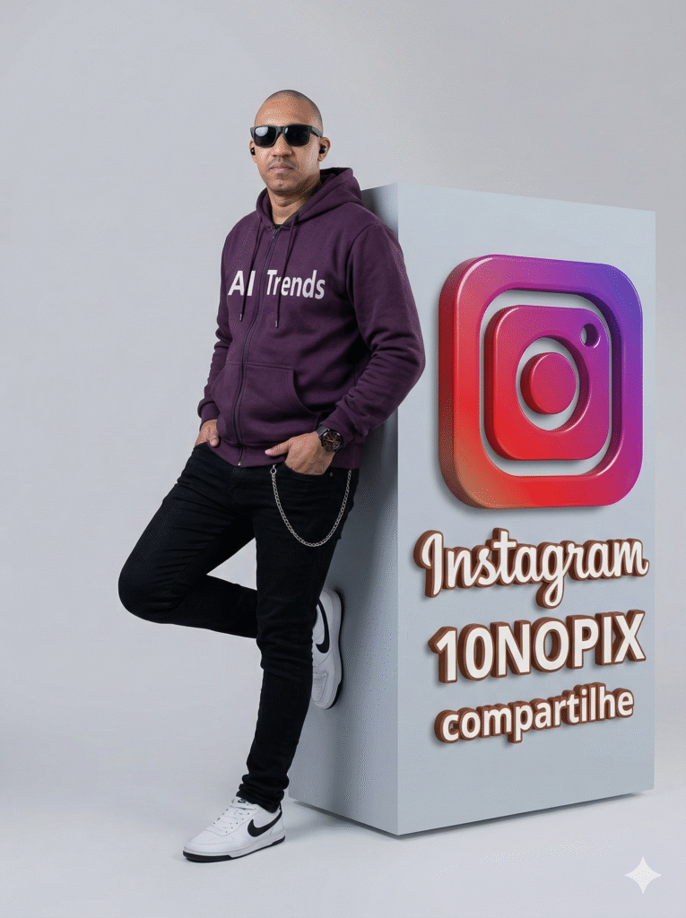 A hyper-realistic, 8k, studio shot captured with a medium shot, eye-level perspective, using a standard lens. The scene features a person leaning casually against a large, light grey rectangular 3D block. The person, with uploaded face as reference, is wearing a dark purple zip-up hoodie with “AI Trends” text on the chest, black skinny jeans with a silver chain hanging from the belt loop, white sneakers with black accents, black sunglasses, black earbuds, and a watch on their left wrist. Their left leg is bent with the foot resting against the block, and their left hand is in their pocket, while the right arm is bent with the hand near the hip. The large 3D block, positioned to the right of the frame, features a prominent, glossy, gradient 3D Instagram logo (transitioning from vibrant red to deep purple) on its front face. Below the logo, highly detailed 3D text reads “Instagram”, followed by “10NOPIX”, and then “compartilhe”, all rendered in white with a subtle brown outline and shadow effect, giving them depth. The background is a seamless, plain light grey wall, matching the block. The image utilizes soft, cinematic lighting with subtle, directional shadows, highlighting the highly detailed textures on the clothing and the glossy, reflective surfaces of the 3D elements.