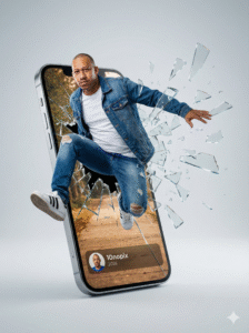 Uma foto de estúdio cinematográfico hiper-realista, 8k, retratando uma cena surreal em que uma pessoa está dinamicamente a sair de um ecrã de smartphone prateado moderno. O personagem, com o rosto carregado como referência, é capturado no ar num salto poderoso, vestindo uma t-shirt branca, um casaco de ganga azul, jeans de ganga azul rasgado e tênis brancos com listras pretas, com um braço estendido como se estivesse a empurrar através da tela e uma perna dobrada alta . O smartphone, posicionado centralmente e ligeiramente ângulo, tem o seu ecrã despedaçado precisamente onde o personagem emerge, com inúmeros cacos de vidro altamente detalhados e afiados explodindo para fora, refletindo a iluminação brilhante do estúdio. A tela do telefone exibe um caminho externo desfocado e em tons quentes e, na parte inferior, um ícone de foto de perfil com o rosto carregado como referência, rotulado “AI Trends” e “2026”. A composição é um ângulo largo ligeiramente baixo, enfatizando a ação dinâmica do personagem contra um fundo de estúdio cinza claro limpo e neutro. A iluminação softbox cinemática proporciona iluminação uniforme, alta -fidelidade, com iluminação sutil aro destacando o personagem e o telefone, lançando sombras suaves realistas.