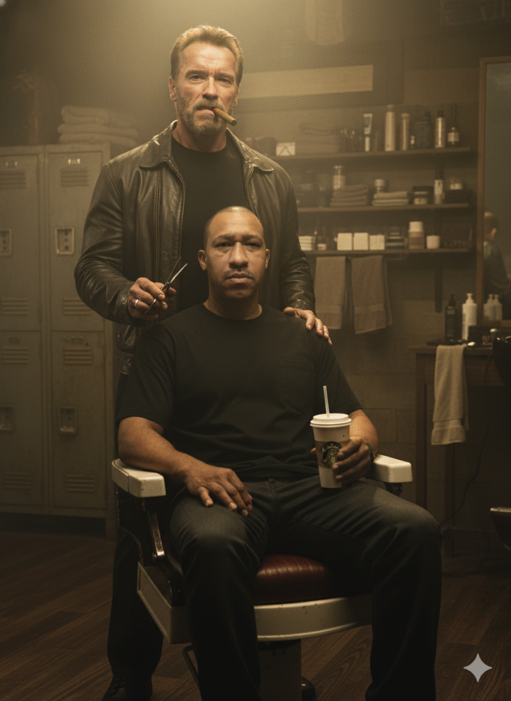 O Arnold Schwarzenegger está fumando um charuto na boca e segurando uma pequena tesoura de barbeiro na mão esquerda, como se estivesse prestes a cortar o cabelo do homem. O cenário é uma barbearia ou vestiário com armários de metal atrás, luz baixa e intensa, com fumaça e neblina.