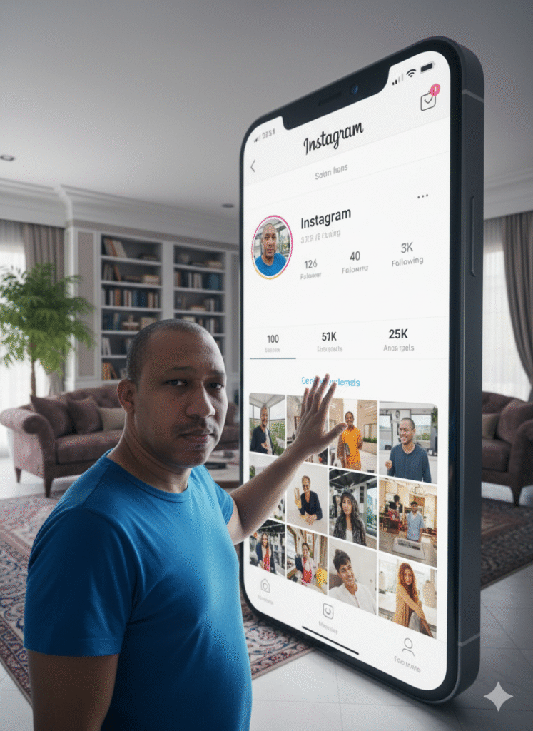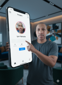 Igor Palmeira Make an ultra-realistic close-up image of a person standing next to a monumental smartphone displaying an Instagram profile (use the provided image as a reference for the screen). Keep the same characteristics of the person in the image, gently touching the screen with one hand. The skin texture should be natural and detailed, with soft studio lighting and realistic photographic shadows. The background should be a luxurious living room with cinematic depth of field and 8K photographic realism — immersive.