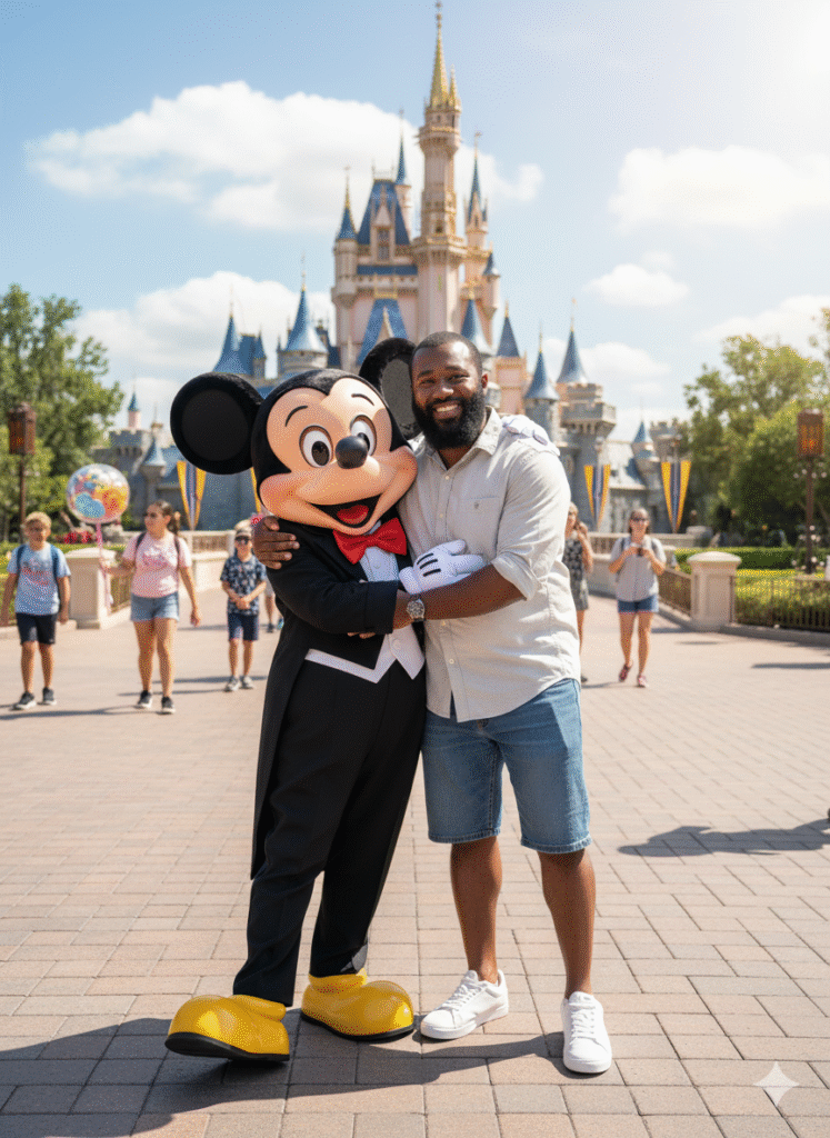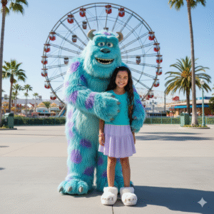 “Una foto de cuerpo entero muestra a una niña y a Sulley, la mascota de Monsters, Inc., posando juntos al aire libre en un día soleado. La niña, con cabello largo, negro y ondulado, sonríe a la cámara, vistiendo un top azul turquesa, una falda lila claro y pantuflas blancas peludas que se asemejan a pies de monstruo. Sulley, un gran monstruo peludo azul y morado, está a su lado, abrazándola. Al fondo, se ve una gran rueda de la fortuna con góndolas rojas bajo un cielo azul despejado. Hay palmeras en la zona y suelo de cemento bajo sus pies. La iluminación general es brillante y alegre.”
