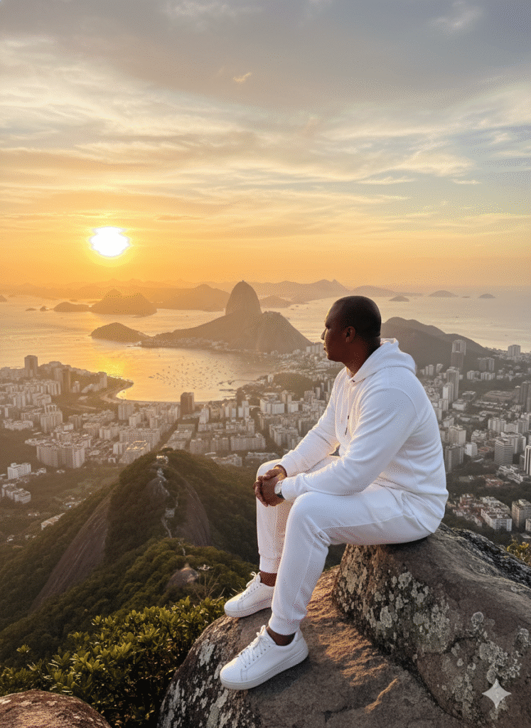 A man sitting on a big rock at the top of a mountain during sunset, overlooking the city of Rio de Janeiro with Sugarloaf Mountain in the background. He is wearing a modern white outfit: white hoodie, white jogger pants, and white sneakers. The atmosphere is warm with golden and pink sky colors, realistic photography style, cinematic lighting, high resolution, natural shadows, ultra detailed.