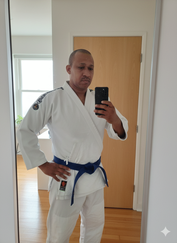 O look deve ser composto por um quimono de artes marciais tradicional, com tecido texturizado e detalhes de bordados nos ombros, além de uma faixa amarrada na cintura indicando experiência e disciplina. As mangas devem estar levemente dobradas, reforçando a sensação de preparo e movimento.