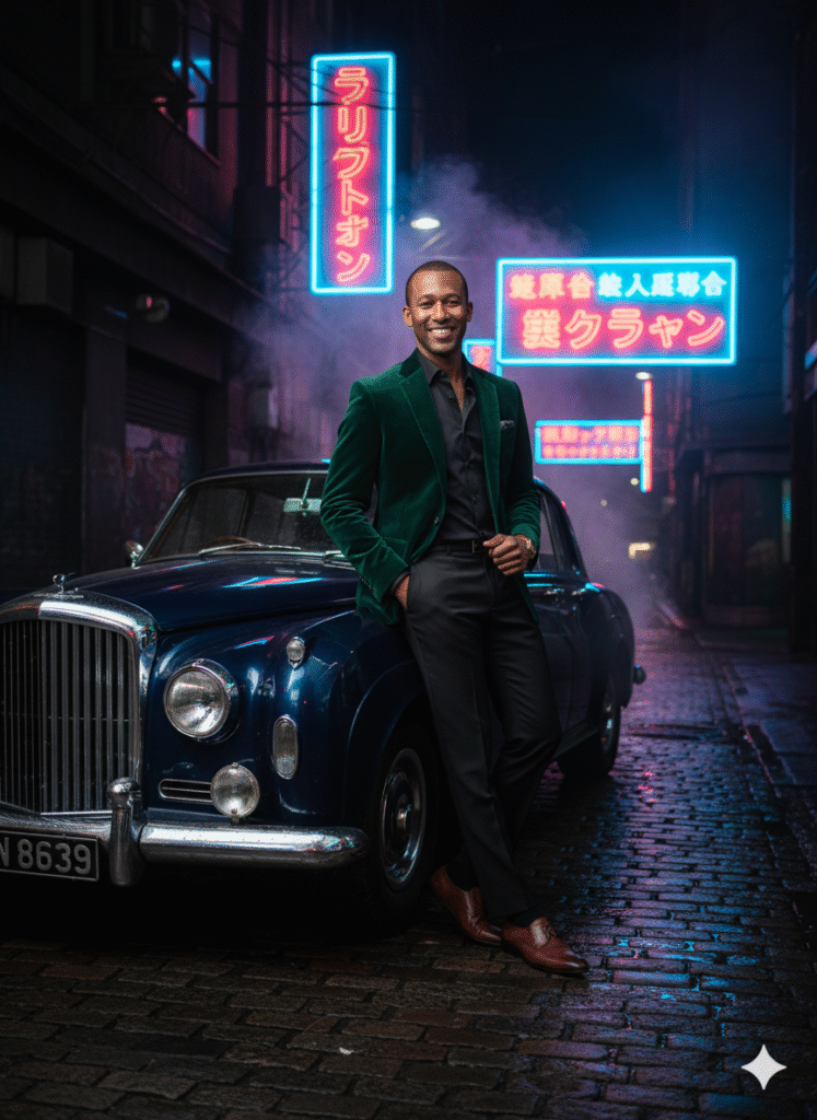 *crie uma imagem com as caracteristicas do personagem acima, encostado em um carro de luxo vintage (Rolls-Royce ou Bentley) azul-marinho, em uma rua de paralelepípedos à noite. Ele veste um blazer de veludo verde-esmeralda, uma camisa social preta desabotoada e calças pretas, com sapatos loafers de couro marrom. O fundo é um beco urbano escuro iluminado por letreiros de neon brilhantes e coloridos (azul, vermelho e rosa) no estilo cyberpunk/Blade Runner. A cena tem uma atmosfera elegante, noturna e cinematográfica. Fotografia de moda, hiper-realista, iluminação dramática.*