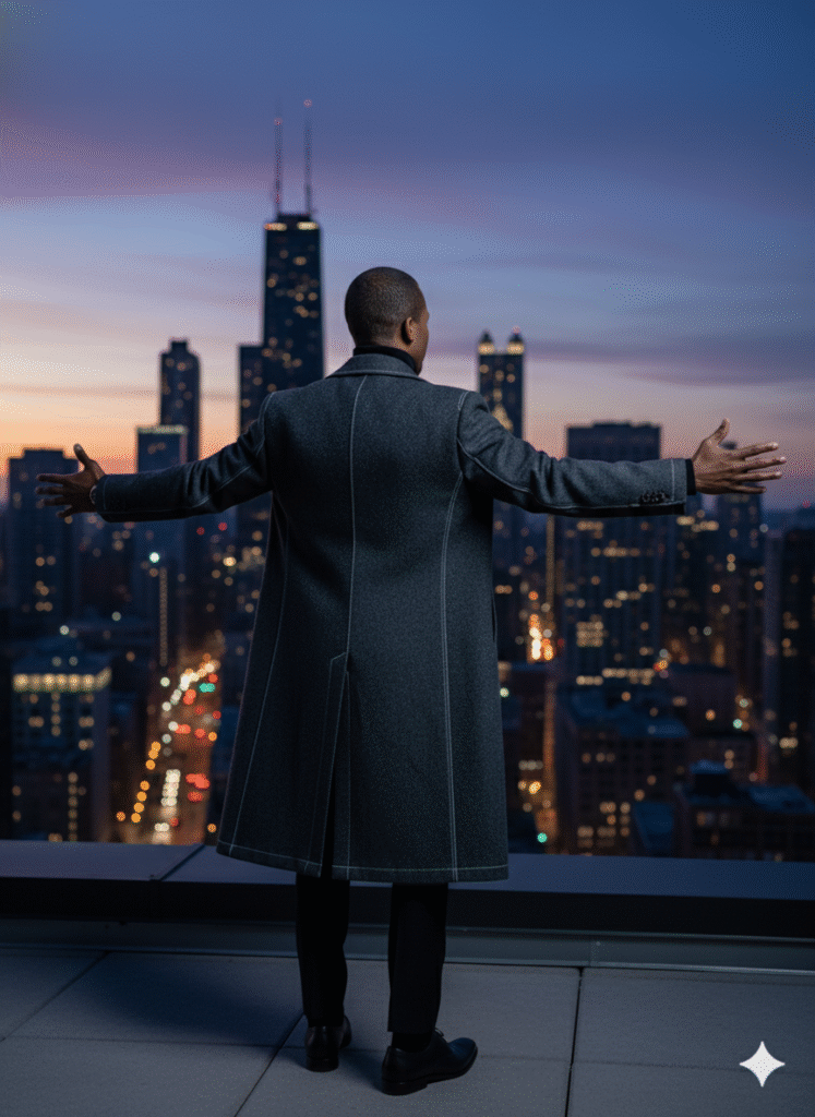 *Um homem com as mesmas caracteristicas da imagem, em pé no topo de um arranha-céu ou terraço, olhando para o horizonte com os braços abertos. Ele veste um sobretudo longo cinza-carvão com costuras contrastantes (ou pesponto) brancas e uma suéter de gola alta preta. O fundo é um horizonte urbano (skyline) de uma grande cidade (como Chicago ou Nova York) ao anoitecer ou crepúsculo. As luzes da cidade estão acesas e desfocadas (bokeh) no plano de fundo. A cena é dramática e épica, com iluminação fria. Fotografia de moda urbana, hiper-realista, ângulo amplo.*
