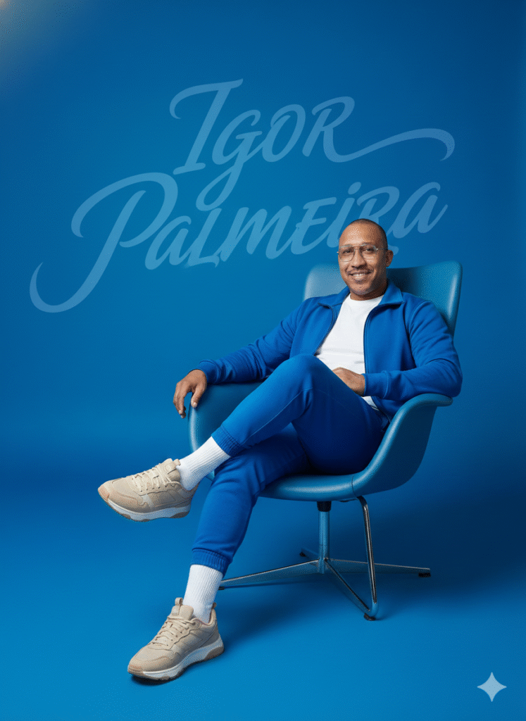 “Photorealistic 8K full-body portrait of a stylish man (see attached photo) sitting casually on a modern blue designer lounge chair, leaning back with legs crossed and smiling confidently. He wears a bold blue tracksuit, matching joggers, white socks, and chunky beige sneakers. Natural skin tone, realistic facial details, modern glasses, and relaxed posture. Background: seamless blue studio with a large light-blue abstract “IGOR PALMEIRA” shape for a clean, magazine-style composition.