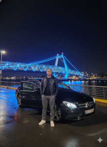Crie um retrato de corpo inteiro (8K) do homem da imagem de referência, posando à noite em um Mercedes-Benz C220D preto com uma ponte futurista azul iluminada ao fundo. O homem veste jaqueta preta, calça cinza e tênis branco, com a porta traseira do carro visível.