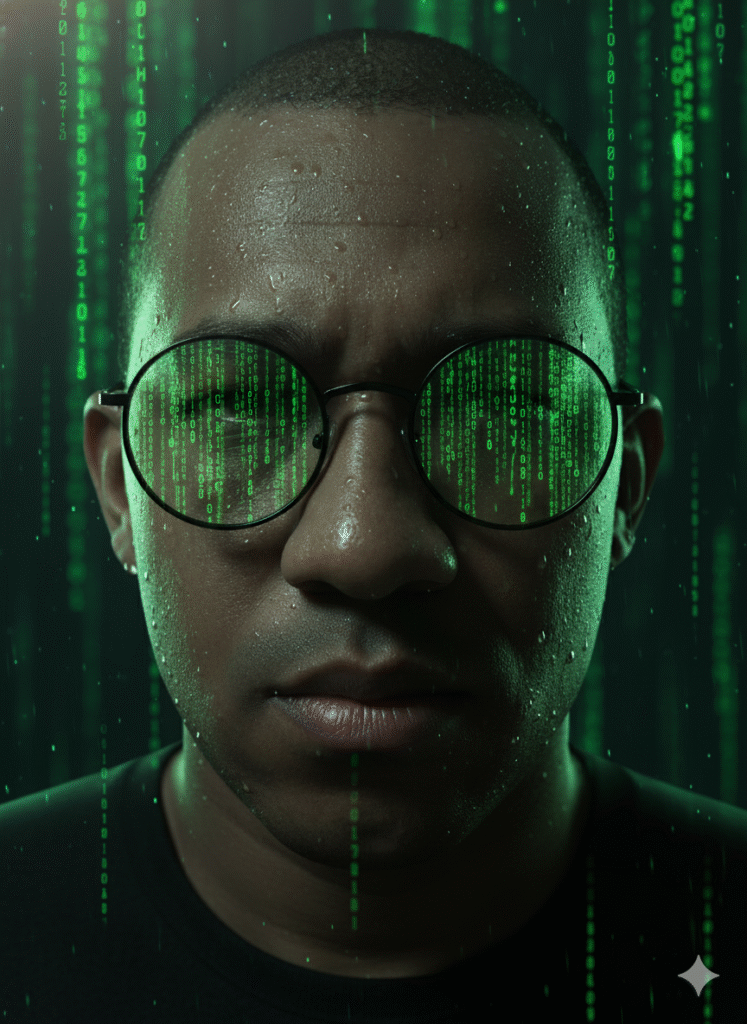 “Um retrato em grande plano de uma pessoa jovem com pele molhada e gotas no rosto, usando óculos redondos que refletem fluxos de código binário verde brilhante. A atmosfera é futurista e cyberpunk, inspirada no The Matrix. A iluminação é mal-humorada e dramática, com destaques verdes neon e sombras profundas. A expressão da pessoa é intensa e focada, sugerindo inteligência e determinação. O fundo apresenta linhas em cascata de código digital, suavemente desfocadas para melhorar a profundidade. Iluminação cinematográfica realista, texturas ultra detalhadas, contraste alta e reflexões brilhantes. “