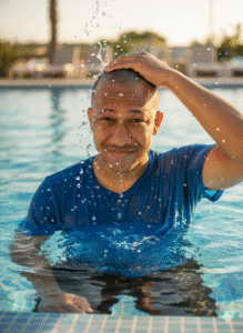 IGOR PALMEIRA A photorealistic summer lifestyle portrait of a young man (use the uploaded reference photo for exact face, hairstyle, and skin tone). He is captured mid-action in a crystal-clear swimming pool, looking playfully confident at the camera while running one hand through his wet hair. Dynamic splashes of water are frozen mid-air, sparkling under the golden sunlight. Keep his natural youthful charm, fresh skin, and casual sporty teen vibe consistent with the reference photo.