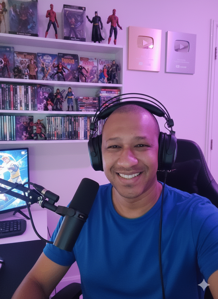 “Un streamer gamer sonriendo, con expresión divertida y genuina. La escena es un setup de streaming de alta gama, con iluminación LED ambiental en tonos morados y azules neón que resaltan el fondo. Se ven estanterías blancas llenas de coleccionables: figuras de acción detalladas de superhéroes y personajes de videojuegos, videojuegos apilados, cómics y algunos libros. En un lugar prominente del fondo, se muestran orgullosamente dos placas de YouTube de 1 millón (placa dorada) y 100 mil suscriptores (placa plateada), brillando sutilmente con la luz ambiental. Un micrófono de estudio profesional está frente al streamer, y se aprecian unos auriculares gaming. La calidad de la imagen es fotorrealista, con detalles finos en la piel, el cabello y los objetos, capturando la atmósfera vibrante y personalizada de un cuarto de streamer.”