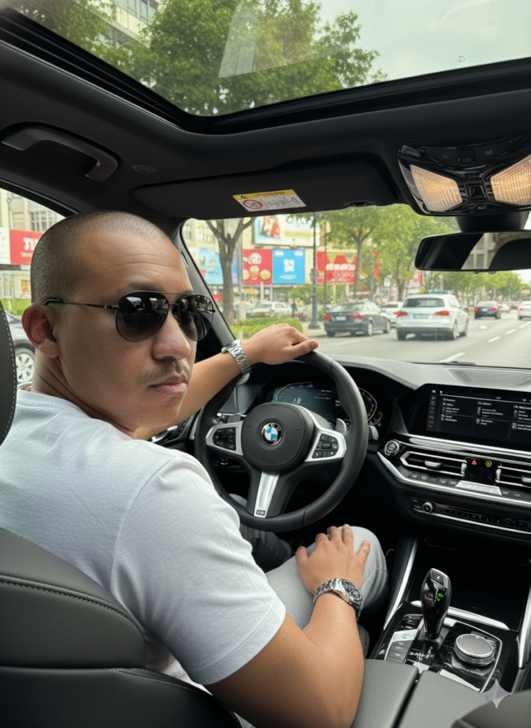 A pessoa na foto de retenção sentada no banco do motorista de uma BMW de luxo, vista por trás do ombro, com a mão no volante. A pessoa está usando uma elegante camiseta branca, óculos escuros e um relógio prateado. O interior do carro é moderno, com assentos de couro e um teto solar panorâmico, banhado por luz natural.