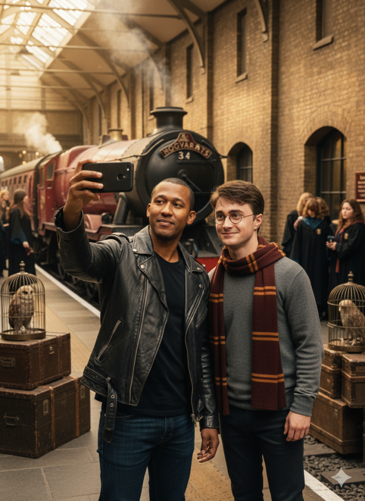 Crie uma imagem de uma selfie realista na Plataforma 9 3/4 do universo Harry Potter.