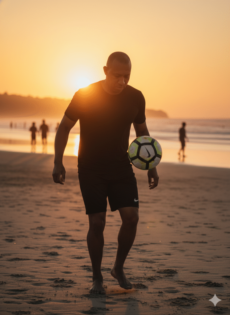 Ele está em uma praia, fazendo malabarismos ou controlando uma bola de futebol da Nike.