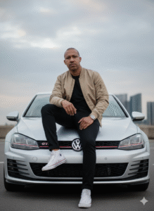 Um homem (com as mesmas características da imagem fornecida) sentado no capô de um golf GTI turbo prata, em uma cena cinematográfica com iluminação suave e céu nublado ao fundo. A pessoa usa uma jaqueta bomber bege, calças pretas e tênis brancos de cano alto com o logotipo da estrela visível. A postura é relaxada e confiante: uma perna dobrada sobre o capô, a outra estendida, com uma mão apoiada no joelho e a outra apoiada no capô do veículo. O golf exibe com destaque o emblema da GTI na grade frontal, com um dos faróis claramente visível. A composição da imagem enfatiza os contornos do carro e do indivíduo, com profundidade de campo cinematográfica e textura ultra-realista nos tecidos, carroceria e pele. A cena transmite uma atmosfera urbana elegante e imponente.