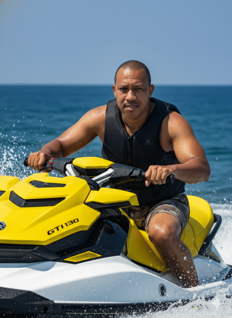 Crie um retrato ultra-realista de um jovem ( usando a foto como referencia ) no jet ski Sea-Doo GTI 130 2015. Ele veste colete salva-vidas preto e shorts camuflados. A pose é de ação, com o corpo inclinado para frente e salpicos de água. A expressão é natural e ligeiramente sorridente, com os olhos focados. A foto será um close-up, com iluminação natural, detalhes nítidos de respingos de água e textura de pele realista.