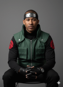 Retrato 1/2 de um homem (com rosto, tom de pele e penteado idênticos à foto de referência original), aparecendo em um cosplay de ninja no estilo Orochimaru, criado por um fotógrafo profissional. Ele veste um colete grosso verde-escuro com zíper prateado na frente e uma roupa de combate preta justa. Luvas pretas cobrem suas mãos, e uma bandana da Vila da Folha (Konoha) está amarrada de forma impecável em sua testa, com símbolos circulares vermelhos em ambas as mangas.