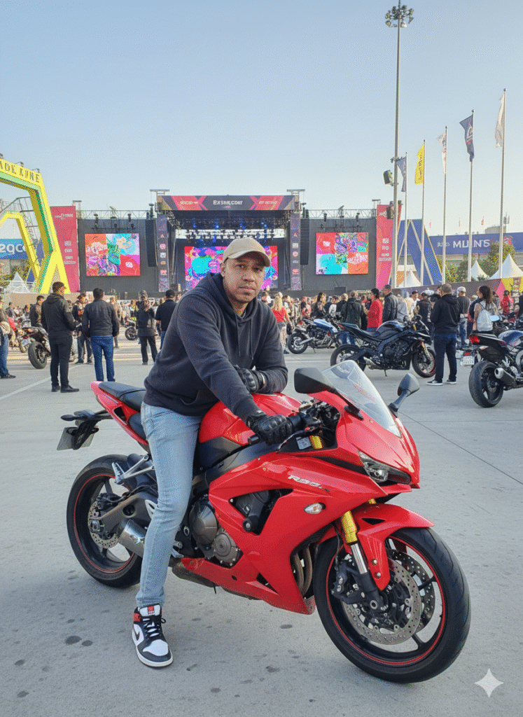 Crie uma fotografia do homem da foto em anexo sentado em uma motocicleta esportiva vermelha, apoiado levemente no guidão com uma postura descontraída e confiante. Ele usa um look casual composto por boné neutro, moletom escuro, jeans claros ajustados e tênis esportivos. As luvas completam o visual de piloto.