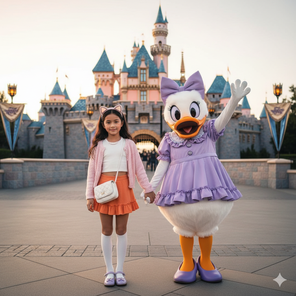 Crea una imagen cinematográfica ultrarrealista y glamurosa, una copia exacta al 100% de una niña de 7 años con maquillaje sencillo (usando esta foto). No modifiques su rostro; copia sus rasgos faciales con precisión. Se trata de una foto de cuerpo entero de una niña y Daisy Duck posando juntas frente al Castillo de la Bella Durmiente en Disneyland, bañadas por la suave y cálida luz del amanecer o el atardecer. La niña, de pie a la izquierda, tiene el pelo largo, ondulado y negro, y mira directamente al espectador con una leve sonrisa. Lleva un conjunto coordinado compuesto por un top corto blanco, una minifalda plisada naranja con bajo de volantes, un cárdigan de punto rosa claro, calcetines blancos hasta la rodilla y zapatos Mary Jane lila. También lleva un bolso de hombro acolchado blanco y una diadema con orejas de gato. Su mano izquierda está entrelazada con la derecha de Daisy Duck.