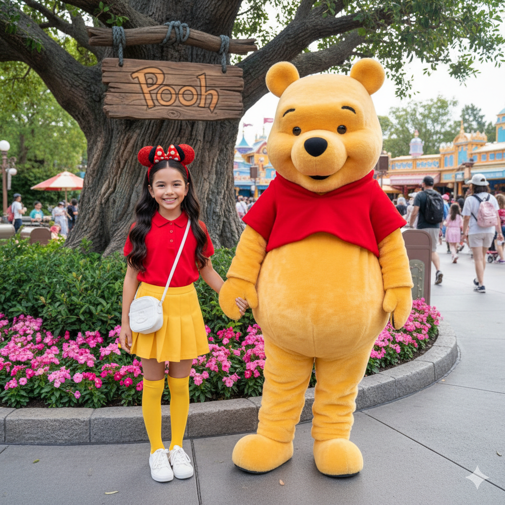 “Una niña con cabello negro largo y ondulado, vestida con un atuendo inspirado en Winnie the Pooh, posa junto a una persona disfrazada de Winnie the Pooh. La niña lleva un top rojo, una minifalda amarilla plisada, calcetines amarillos hasta la rodilla y zapatillas blancas. También lleva una diadema roja y amarilla con orejas de Minnie Mouse y un pequeño bolso blanco. Sonríe y va de la mano con el personaje de Winnie the Pooh, quien viste su clásica camiseta roja. Están al aire libre, en lo que parece ser un parque temático, con un gran árbol con un letrero de ‘Pooh’ al fondo. Hay flores rosas y otras plantas a su alrededor, y a lo lejos se ven otros visitantes del parque. La iluminación sugiere que es de día.