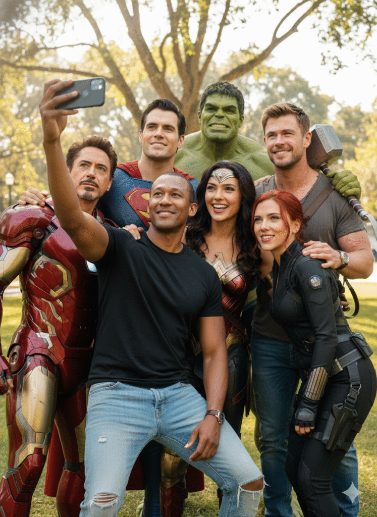 “Uma selfie de grupo ultra realista, centro é a pessoa da imagem anexada, vestindo uma camisa preta e jeans rasgados, segurando um iPhone para a selfie. Ao redor estão Chris Hemsworth como Thor, Gal Gadot como Mulher Maravilha, Scarlett Johansson como Viúva Negra, Mark Ruffalo como Hulk, Henry Cavill como Superman, RDJ em armadura completa todos abraçados, sorrindo, posando casualmente como amigos próximos. Diversão, humor alegre, luz do dia brilhante, qualidade cinematográfica, visual natural, detalhe alta