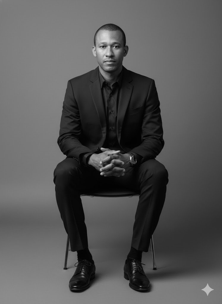 Retrato fotográfico profissional de um homem sentado em uma cadeira moderna, usando um terno elegante e bem ajustado, camisa social escura e sapatos sociais pretos. Ele está com expressão séria e confiante, olhando para a câmera, com as mãos juntas à frente do corpo.