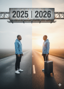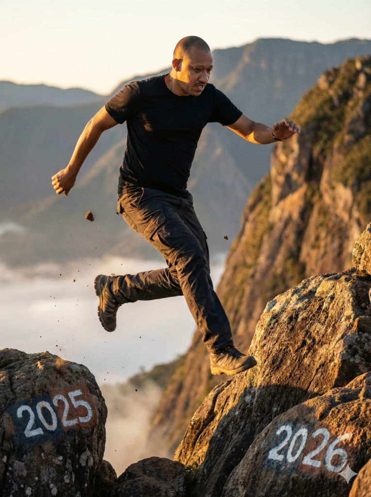 Ultra-realistic, cinematic morning scene of a man mid-jump between two mountain cliffs labeled ‘2025’ and ‘2026’. The man wears a black t-shirt, cargo pants, and rugged mountain shoes. Face fully visible with a natural, determined expression. Soft golden sunrise casting long warm highlights over detailed rocky terrain; crisp cold morning atmosphere with subtle valley haze. High-contrast cinematic lighting, dynamic mid-air pose frozen at peak motion, particles of dust and wind movement around him. Photorealistic textures, deep depth of field, premium ultra-HD film quality.”