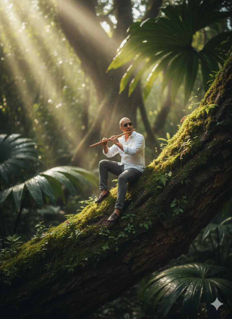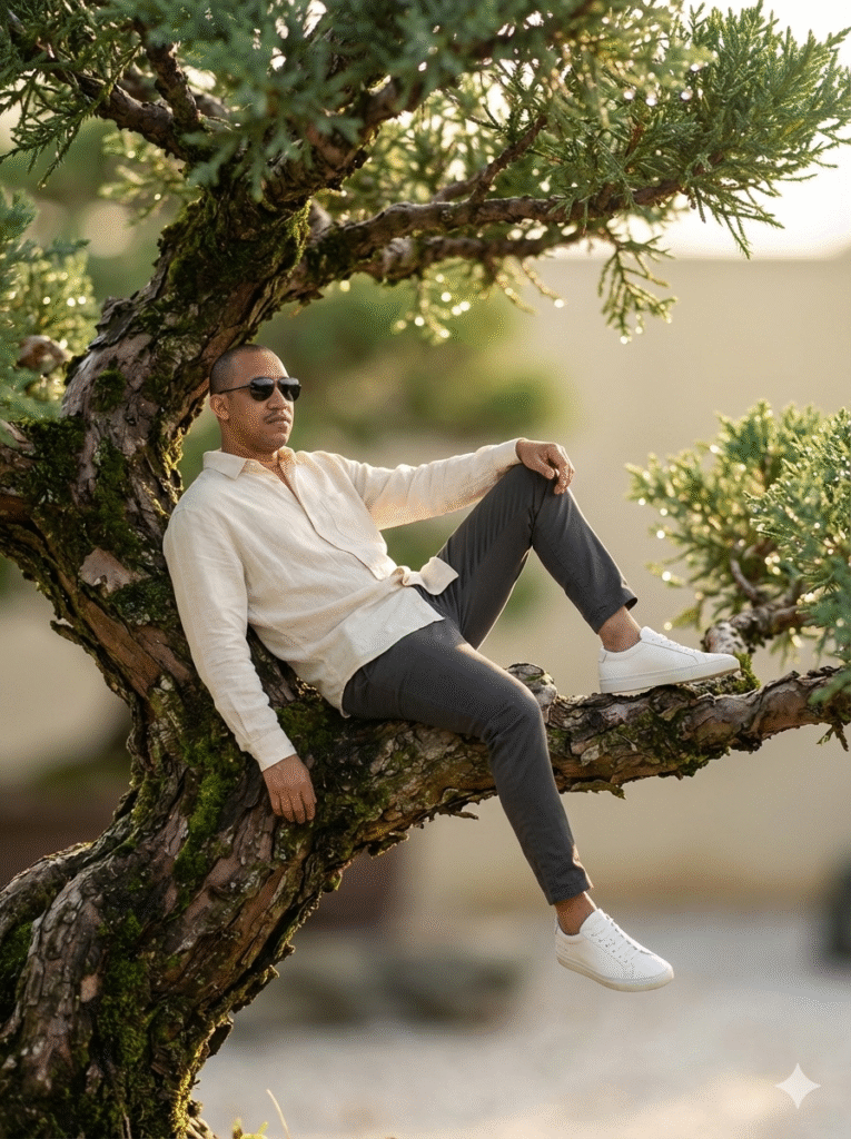 Lighting: Cinematic “Golden Hour” lighting. Warm sunlight filtering through a nearby window, creating long shadows and highlighting the fine fibers of his linen shirt and the microscopic details of the tree bark.