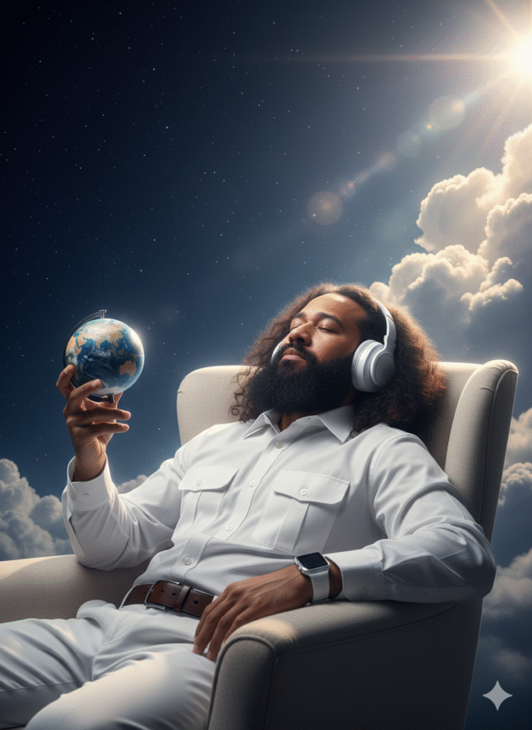 * Personagem: Homem de barba e cabelo escuros, pose relaxada (pernas cruzadas).