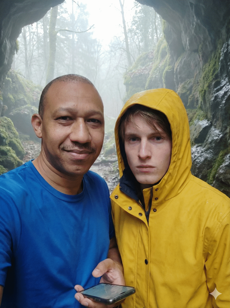 Behind-the-scenes selfie on the DARK TV show set. Use two reference images: the Character Reference Image shows the person who should appear in the selfie, and the Environment Reference Image shows the exact DARK cave location. The final image must look like a realistic behind-the-scenes selfie taken on set. The character JONAS KAHNWALD is standing directly next to the person from the Character Reference Image, both facing the camera and posing together for a selfie. They are close to each other, shoulders nearly touching, natural and relaxed, as if a casual BTS moment between takes. Jonas wears his iconic yellow rain jacket, looks serious and calm, matching his personality from the series. The cave environment in the background must match the Environment Reference Image exactly: same rock formations, same cave entrance shape, same forest surroundings, same moody fog and mist. The lighting is cinematic, natural and slightly cold, with soft diffused daylight filtering into the cave. The image must feel photorealistic, not stylized, not illustrated, not cinematic promo art. It must clearly look like a real behind-the-scenes set photo. Do not change the face, body, hairstyle, or proportions of the person from the Character Reference Image. Do not beautify or alter their appearance. No fantasy elements, no extra props, no text, no logos, no watermarks.
