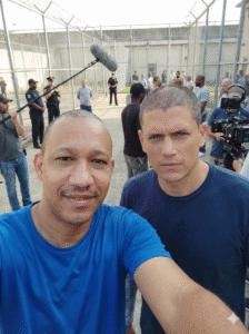 Create a highly realistic behind-the-scenes selfie on the Prison Break set. The person from the uploaded character reference photo is in the foreground, taking a selfie with an outstretched arm, realistic selfie framing, no phone or camera visible. The image itself is the final selfie. The person is posing directly next to Michael Scofield, who is facing the camera with a serious expression. In the background, the prison yard must match the environment reference image exactly: chain-link fences, prison guards, inmates standing around, camera equipment, boom microphone visible, and crew members present. Daylight, neutral natural lighting. The setting feels like a candid moment between takes on a real prison set. Highly photorealistic, natural, not staged. Do not alter the face, hairstyle, or body of the person from the character reference photo.