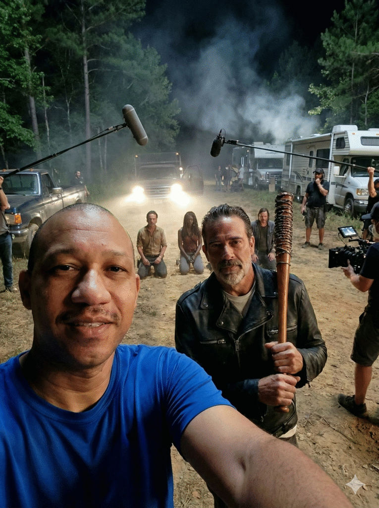 Create a highly realistic behind-the-scenes selfie on The Walking Dead set. The person from the uploaded character reference photo is in the foreground, taking a selfie with an outstretched arm, exactly like a real handheld selfie. The framing and perspective must match a natural selfie shot. No smartphone, no camera, and no device is visible. The image itself is the final captured selfie. The person is posing directly next to Negan, who is facing the camera and standing close, holding his iconic barbed wire baseball bat Lucille. Negan looks calm and confident. In the background, Rick Grimes, Michonne, and other characters are visible kneeling on the ground, exactly like the referenced scene. The environment must match the uploaded environment reference image precisely: outdoor nighttime forest set, dirt ground, parked vehicles with headlights, film lights, boom microphone visible above, camera rig and crew partially visible. Smoke and mist in the air, cinematic night lighting. The scene must feel like a candid behind-the-scenes moment between takes. Highly photorealistic. Do not alter the face, hairstyle, or body of the person from the character reference photo.