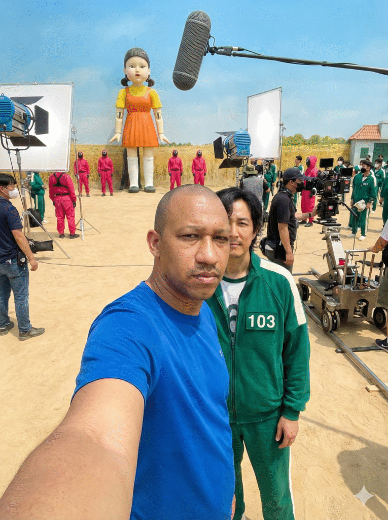 Create a highly realistic behind-the-scenes selfie on the Squid Game set. The person from the uploaded character reference photo is in the foreground, taking a selfie with an outstretched arm, natural selfie framing, no visible phone or camera. The image itself is the final selfie. The person is posing directly next to a Squid Game participant wearing the green tracksuit. In the background, the giant Squid Game doll is visible, exactly matching the referenced environment image. Guards in pink suits, film lights, reflectors, camera equipment, boom microphone overhead, and crew members are clearly visible. The environment is an open sandy field with set structures. Bright daylight, realistic production lighting. The image must feel candid and behind-the-scenes, not promotional. Highly photorealistic. Do not alter the face, hairstyle, or body of the person from the character reference photo.