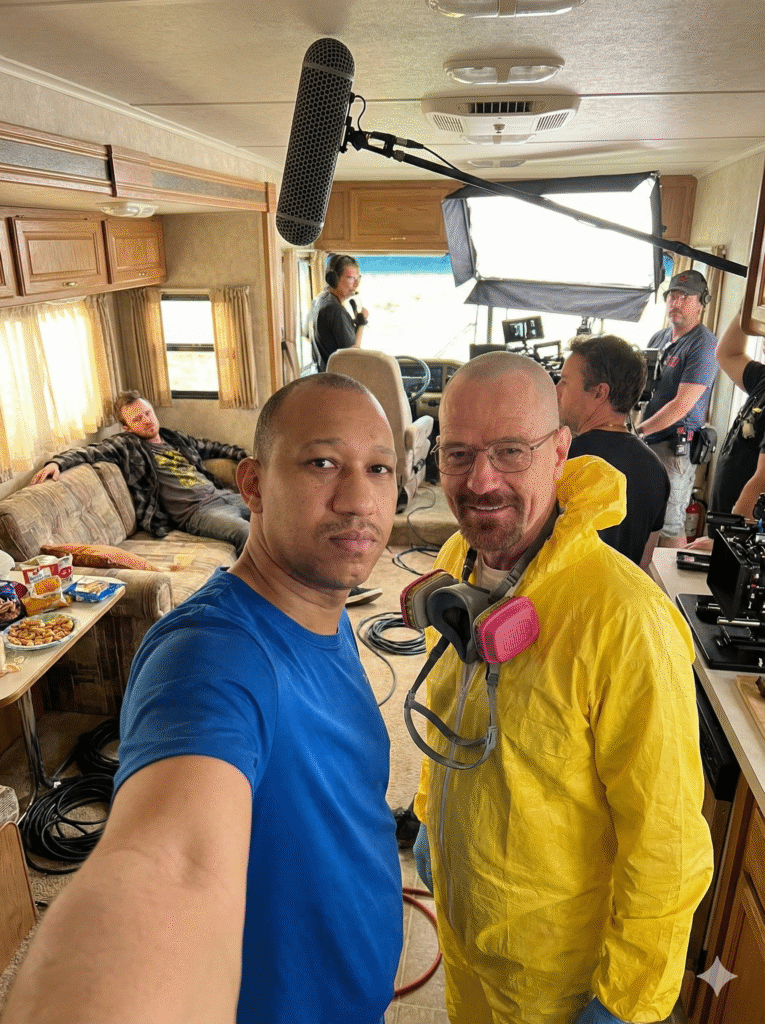 Create a highly realistic behind-the-scenes selfie on the Breaking Bad set. The person from the uploaded character reference photo is in the foreground, taking a selfie with an outstretched arm, exactly like a real selfie. The perspective, framing, and arm position must match a natural handheld selfie. No smartphone, no camera, and no device is visible in the image. The photo itself is the final captured selfie. The person is posing directly next to Walter White, who is facing the camera and clearly interacting with the person. Walter White is wearing his iconic yellow hazmat suit with the respirator hanging around his neck. In the background, Jesse Pinkman is sitting on the couch inside the RV, clearly visible and recognizable, relaxed and slightly slouched. The environment must exactly match the uploaded environment reference image: the interior of the Breaking Bad RV with film lights, boom microphone visible above, camera equipment, crew members partially visible, cables on the floor, snacks on the table, and a realistic on-set production atmosphere. The lighting is natural and cinematic, like a candid behind-the-scenes moment between takes. The image must look like a real behind-the-scenes selfie, not staged, not promotional, highly photorealistic. Do not alter the face, hairstyle, or body of the person from the character reference photo