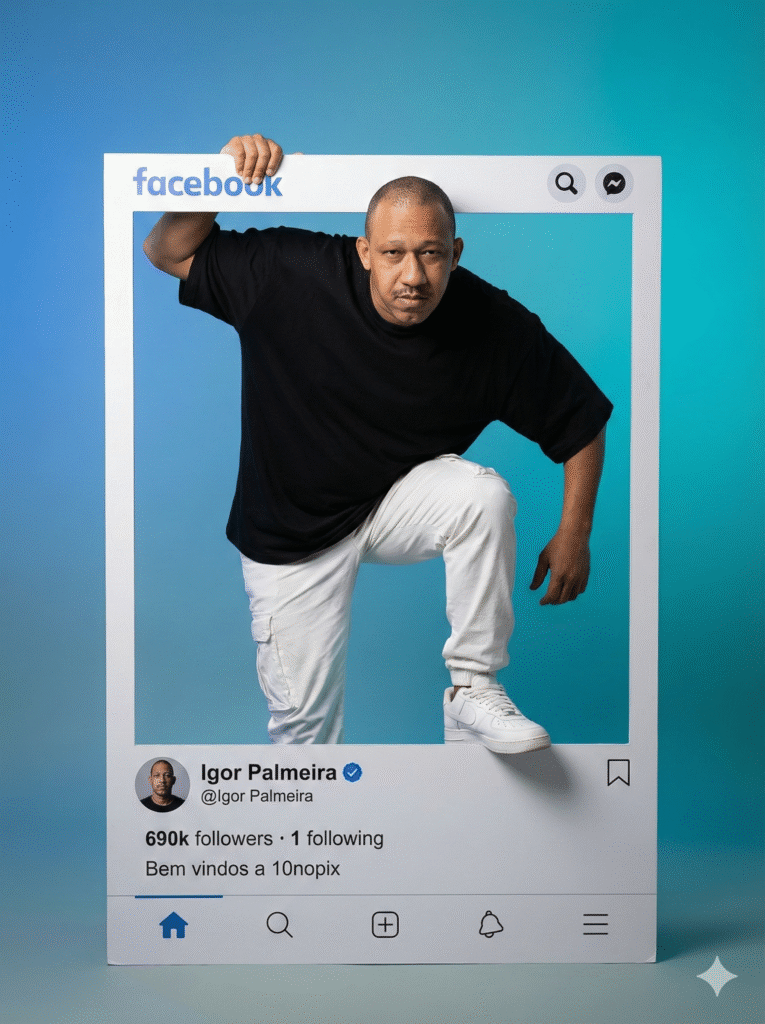 The Facebook frame is ultra realistic with username “Igor Palmeira”, verified badge, display name “690k followers ・1 following”, caption “Bem vindos a 10nopix”, authentic Facebook UI icons (like, comment, share and emoji reactions), and a circular profile picture identical to the subject.