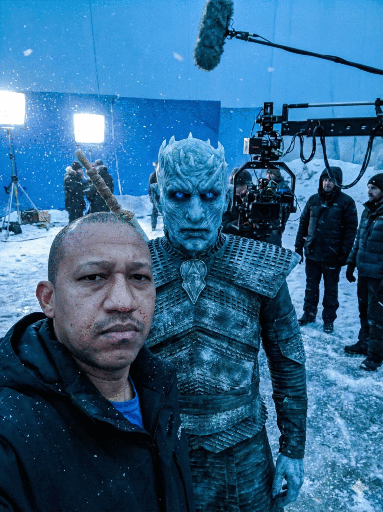 Create a highly realistic behind-the-scenes selfie on the Game of Thrones set. The person from the uploaded character reference photo is in the foreground, taking a selfie with an outstretched arm, natural selfie perspective, no visible phone or camera. The photo itself is the finished selfie. The person is posing directly next to a White Walker THE NIGHT KING, who is facing the camera and standing very close. The White Walker has icy blue skin, glowing blue eyes, and detailed frozen armor. In the background, the environment must exactly match the referenced set: snowy battlefield, cold blue lighting, snow particles in the air, film lights, camera rig, crew members visible, and boom microphone overhead. The ground is icy and snow-covered. The atmosphere is cold, cinematic, and dramatic, but clearly behind-the-scenes. Photorealistic, candid, unstaged. Do not alter the face, hairstyle, or body of the person from the character reference photo.
