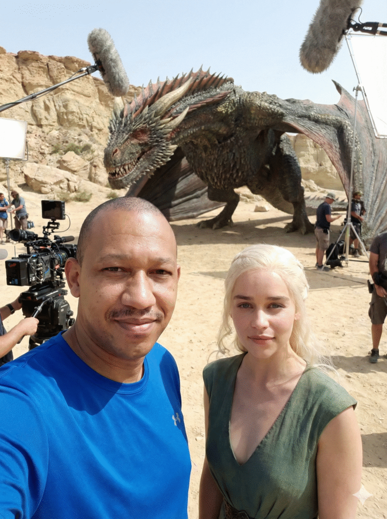 Behind-the-scenes selfie on the Game of Thrones TV show set. Use two reference images: the Character Reference Image shows the person who should appear in the selfie, and the Environment Reference Image shows the exact Game of Thrones desert dragon set. The final image must look like a realistic behind-the-scenes selfie taken during filming. The character DAENERYS TARGARYEN stands directly next to the person from the Character Reference Image, both facing the camera and posing together for a casual selfie. They are close to each other, natural and relaxed, as if the photo was taken between takes on set. Daenerys wears her iconic green dress, her platinum blonde hair styled naturally, and she looks calm, confident, and composed, matching her appearance from the series. Behind them is a large dragon prop positioned exactly as shown in the Environment Reference Image, with visible film equipment such as cameras, lights, boom microphones, and crew members in the background. The environment must match the reference precisely: sandy desert ground, rocky cliffs, bright daylight, realistic set lighting. The image must clearly read as a real behind-the-scenes moment, not a movie scene and not promotional key art. Photorealistic, natural colors, no stylization, no fantasy effects beyond the physical dragon prop. Do not change the face, body, hairstyle, or proportions of the person from the Character Reference Image. Do not beautify or alter their appearance. No text, no logos, no watermarks