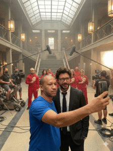Create a realistic behind-the-scenes selfie scene on the set of the TV series Money Heist (La Casa de Papel). The person from the uploaded character reference photo is in the foreground, posing in a natural selfie position with an outstretched arm. The face, hairstyle, body shape and identity of the person from the character reference photo must remain completely unchanged. Standing directly next to the person is the Professor character from Money Heist, wearing his iconic dark suit and glasses, positioned close and clearly posing together with the person for a casual behind-the-scenes selfie. The environment must exactly match the uploaded environment reference image, showing the interior of the Royal Mint with the large central staircase, symmetrical architecture, high glass ceiling, hanging lamps and cinematic lighting. The background must be clearly recognizable as the Money Heist set. Multiple robbers in red jumpsuits are visible throughout the hall, some wearing Salvador Dalí masks, others holding them in their hands, arranged naturally as if between takes. Professional film equipment is visible, including cinema cameras on dollies, boom microphones above, light stands, cables on the floor and partially visible crew members at the edges of the frame. Lighting is cinematic and realistic with soft directional light, subtle haze in the air and natural shadows. Depth of field keeps the faces in the foreground sharp while the background remains detailed but slightly softer. The overall mood is authentic, calm and professional, capturing a real behind-the-scenes moment during filming rather than an action scene