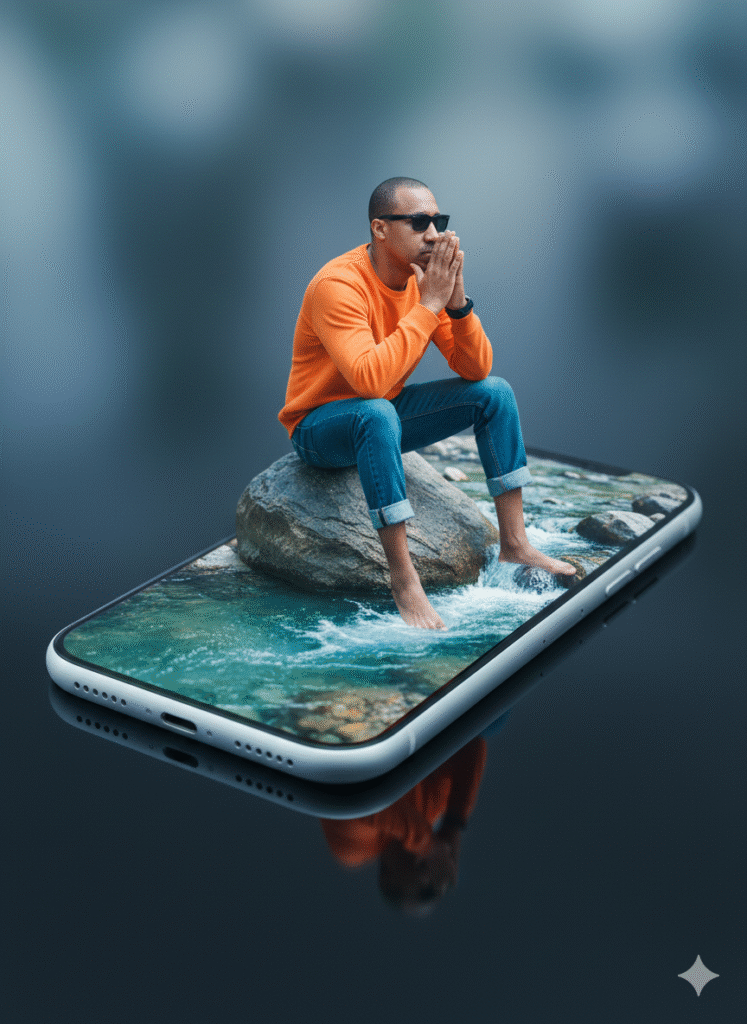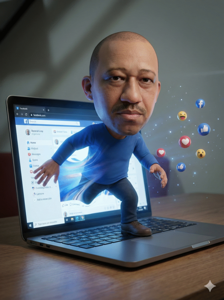 “Ultra realistic portrait of an individual presented inside an oversized Facebook post frame that dominates the scene. Keep the uploaded 100% face consistent and unchanged. The individual’s facial features are delicate yet sharp, clean, and naturally stunning, with eyes locked on the viewer with calm, magnetic intensity and lips softly relaxed and neutral, giving a high-fashion model expression. They stand in a modern, dynamic pose: upper body leaning slightly forward, one hand casually gripping the top edge of the Facebook frame, while one leg steps outward through the frame to create a smooth and stylish 3D illusion.