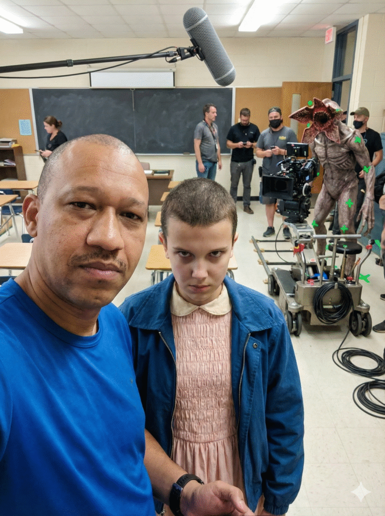 Create a realistic behind-the-scenes selfie on a film set inspired by Stranger Things. The person from the first uploaded reference photo is holding the camera in a classic front-facing selfie pose. The arm is visible in the foreground. The person’s appearance, face, hairstyle, body proportions and clothing must remain exactly the same. Do not alter the person in any way. Standing directly next to the person in the foreground is Eleven (also known as Elfi). Eleven is clearly recognizable, wearing her iconic outfit and hairstyle. She is positioned very close to the person, posing naturally for the selfie, looking directly into the camera with a calm, slightly serious expression. Eleven must appear life-sized, realistic and naturally integrated into the scene. The environment must exactly match the second reference image. A behind-the-scenes film set inside a classroom. Visible elements include school desks and chairs, a chalkboard, lighting equipment, a large cinema camera on a dolly, cables on the floor, a boom microphone above, and crew members in the background. A Demogorgon creature is present on set, clearly visible, with green VFX tracking markers on its body, standing near the camera setup. The scene must feel like an authentic on-set moment during filming. Lighting is realistic, slightly cinematic but natural, matching a real production environment. Depth of field should feel like a real selfie photo, with the foreground sharp and the background slightly softer but clearly readable. The composition must look like a genuine behind-the-scenes selfie taken during production. No fantasy look, no illustration style, no CGI feel. Ultra-photorealistic, documentary-style realism. Do not change the set layout. Do not move characters to different positions. Do not add or remove objects. No exaggerated poses. No stylization. The final image should look like a real photo taken on the Stranger Things set.